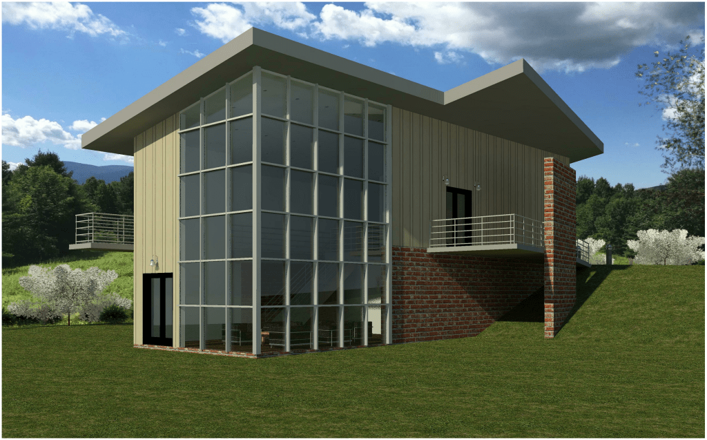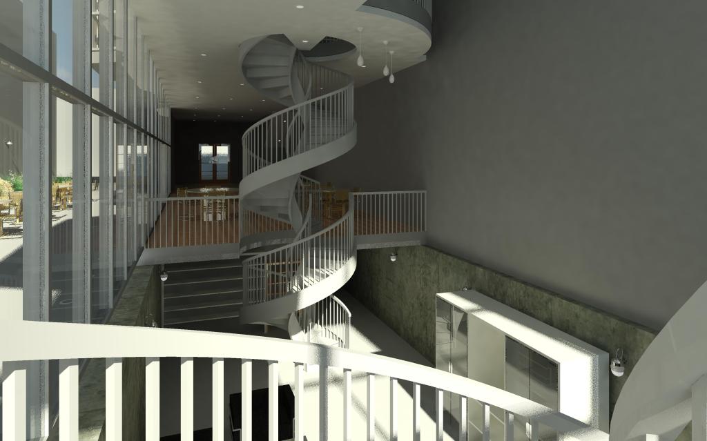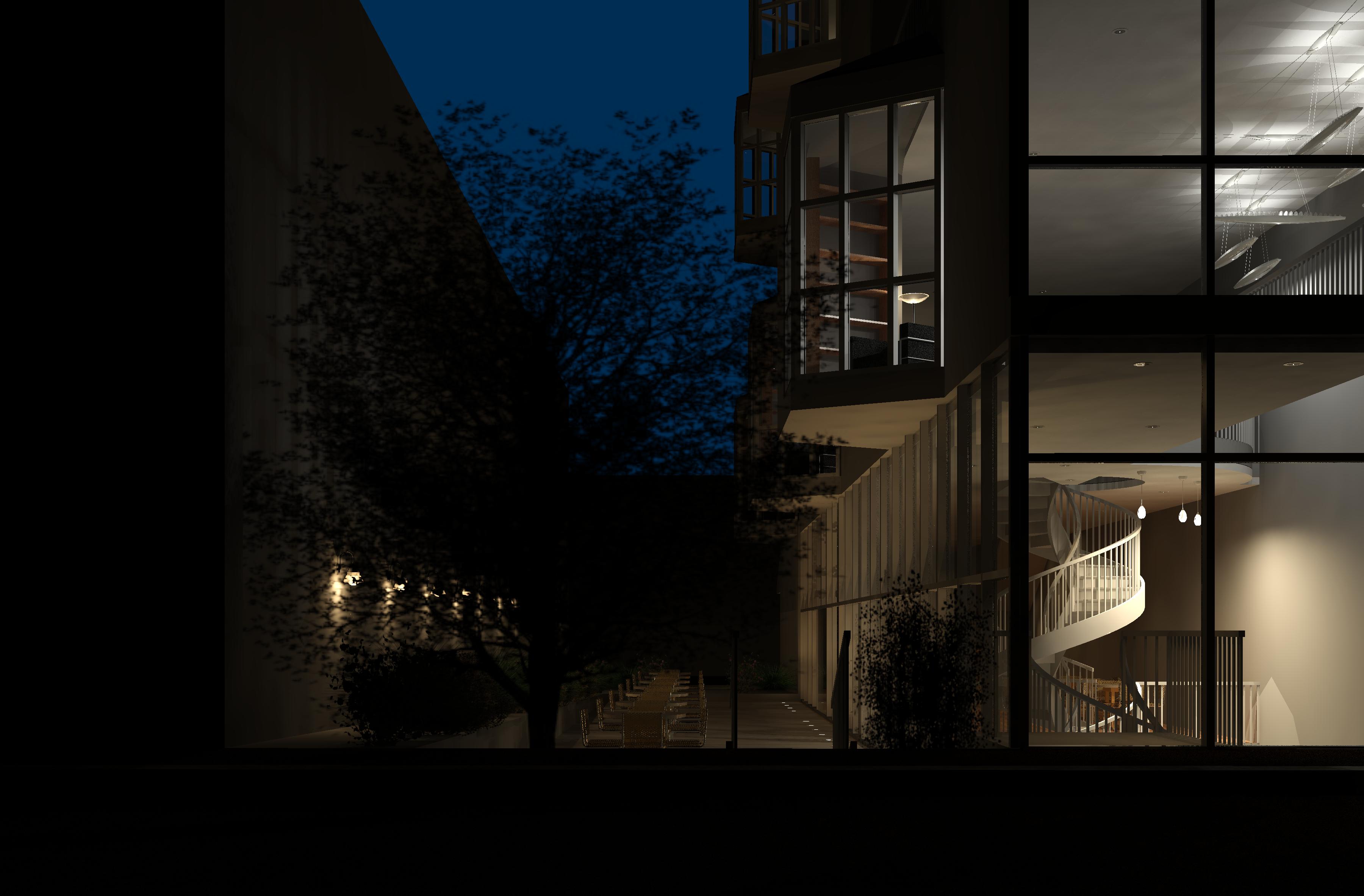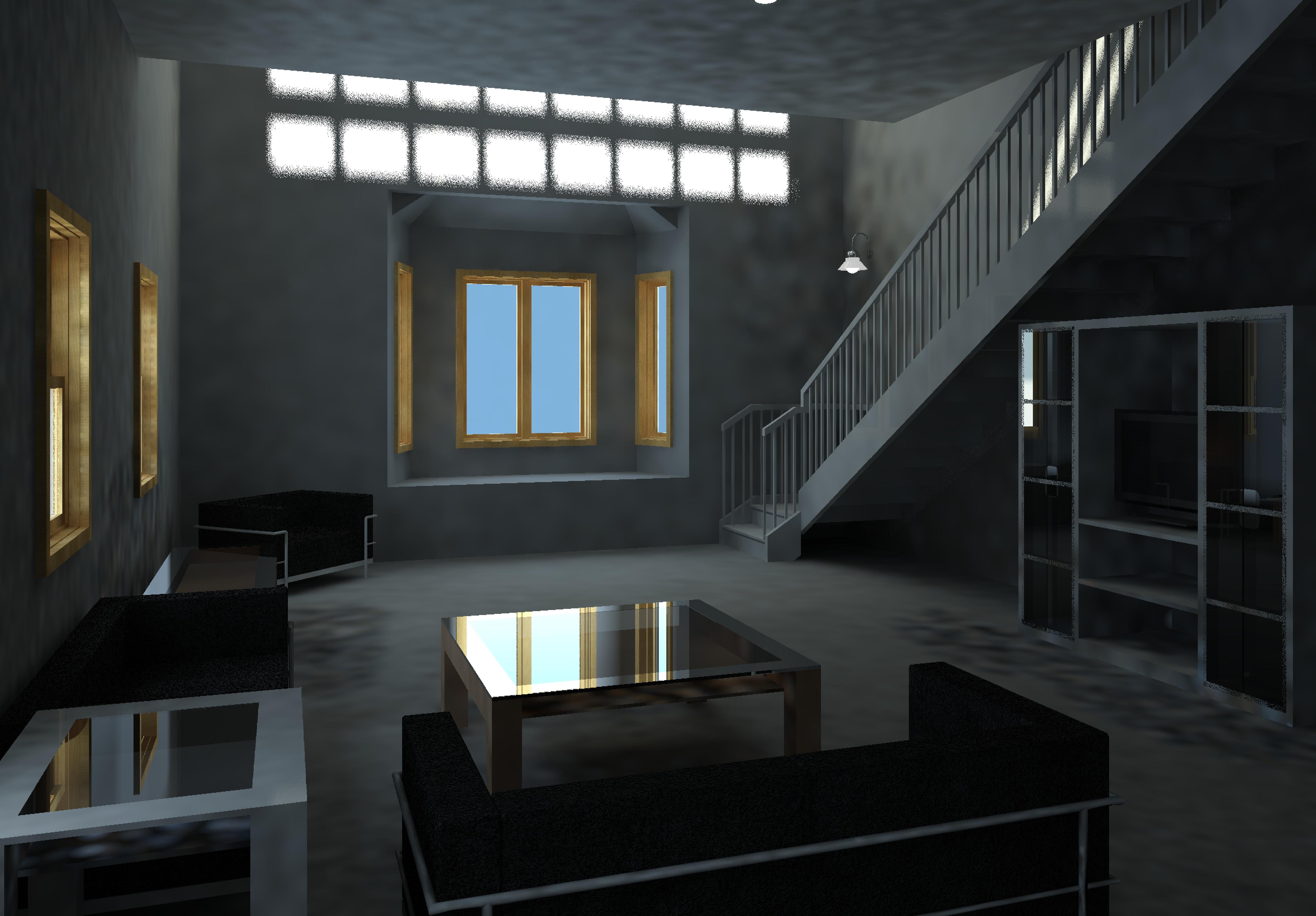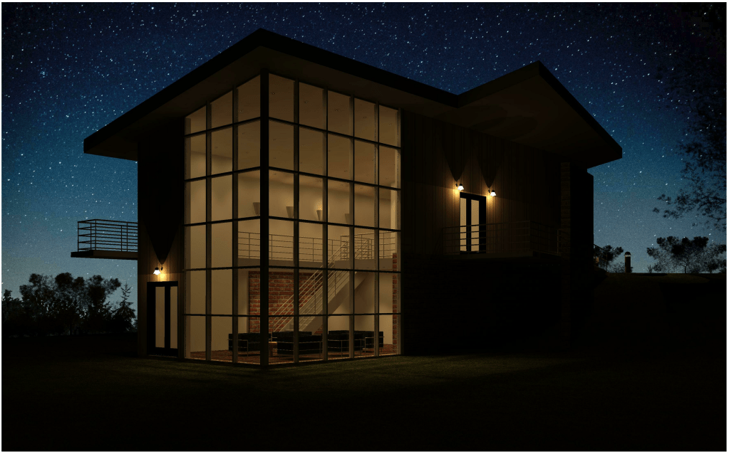 Similar to the tutorial house, I adjusted the time-of-day settings to create interesting renderings that showcased unique elements of my building, like the spiral staircase to the basement pit and the light cast from the sawtooth roof in the living room. The nighttime rendering served as a showcase of the light fixtures.