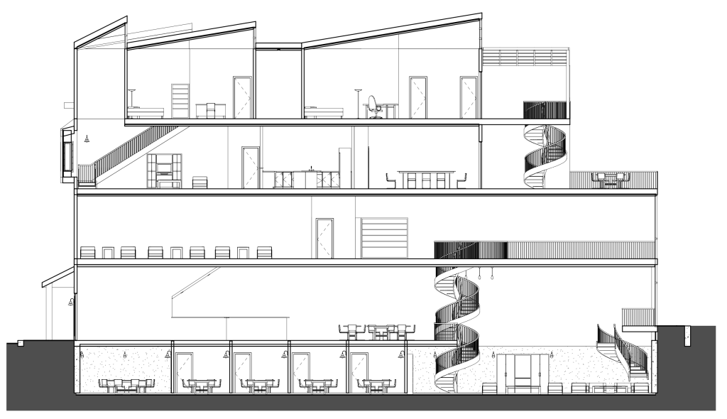 My building held a 2-floor residence above a board-game café and lounge. The café spanned the basement with individual board game rooms, the ground floor register and coffee bar, and the second floor lounge with bay window nooks. The third floor was the first residential floor with a kitchen, dining room, and porch; the top floor had bedrooms and a covered balcony.