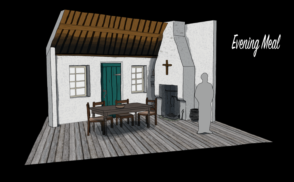 This project was the first exploration into a finalized rendering. I was first tasked with researching a setting (see caption above), then building a two-wall set of that setting in SketchUp and dressing it with furniture from the 3D Warehouse. I then exported the image of the SketchUp model into Photoshop, where I traced the outlines and added color, texture, and shadows.