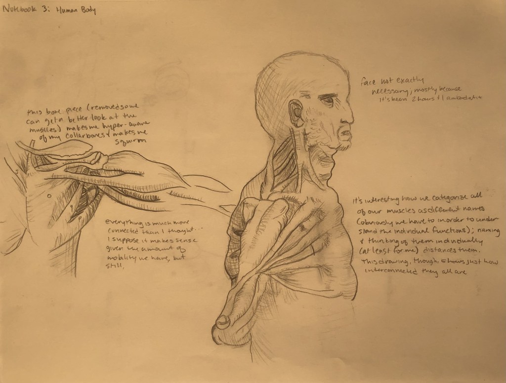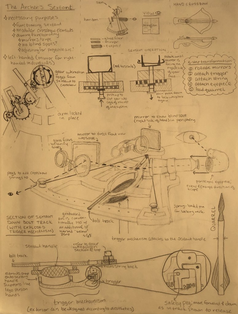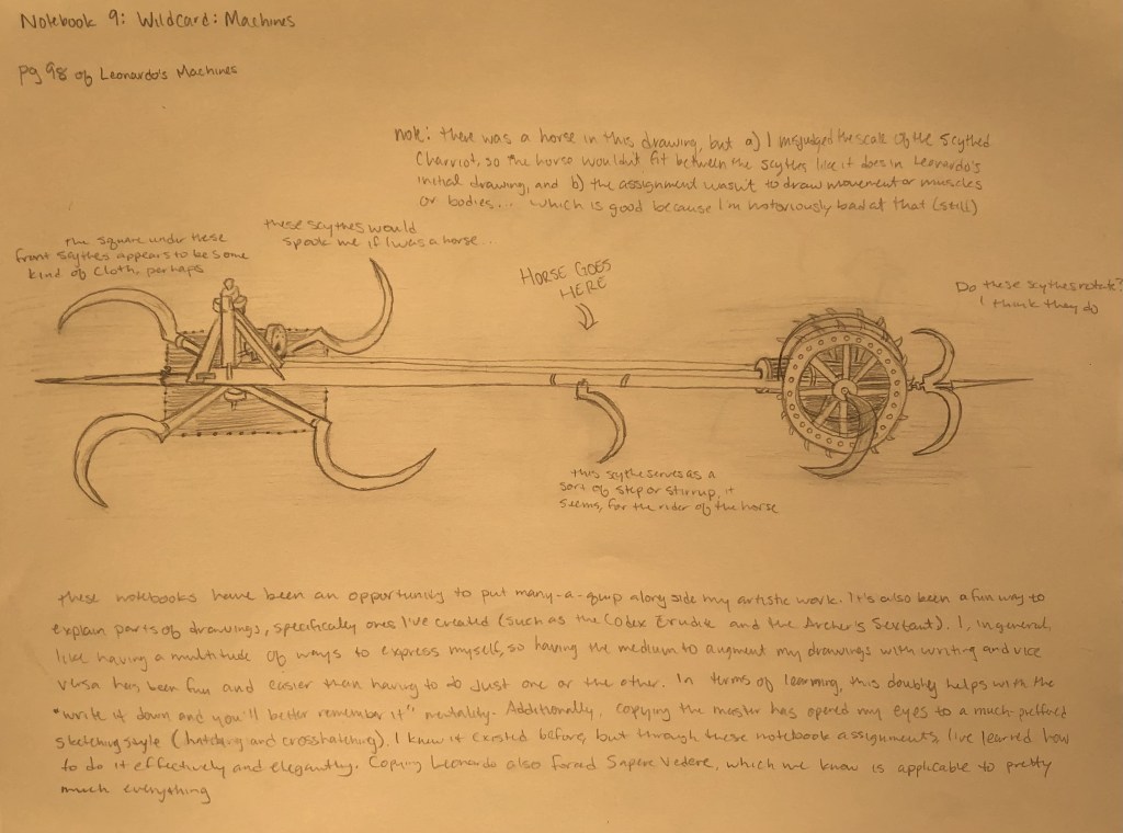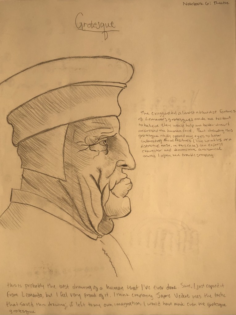 Notebook Assignments were the most numerous. These weekly assignments each surrounded a topic that Leonardo had a particular interest in. For each topic, we could either explore an invention of our own (The Archer’s Sextant above falls under the topic of Machines) or observe and copy one of Leonardo’s many sketches pertaining to the topic (the Grotesque to the right is an exercise in Theatrical expression).